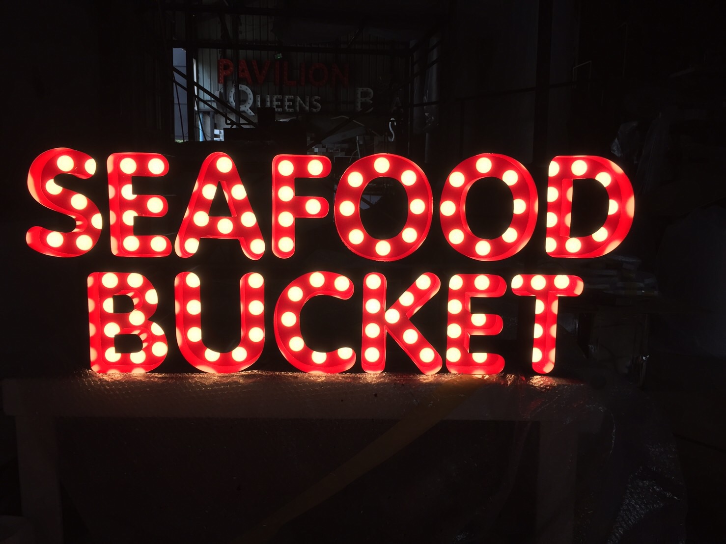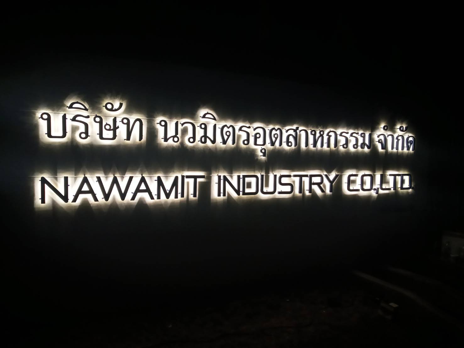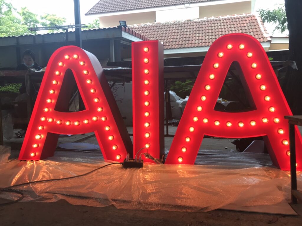 ป้ายที่แสงสว่างออกมาจากตัวอักษรออกมาด้านหน้าอักษร