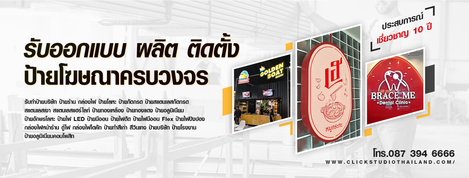 ผู้ที่มีประสบการณ์ด้านการรับทำป้ายฆษณามามากกว่า 10 ปี เราให้คำปรึกษาและบริการกับลูกค้าในกลุ่มธุรกิจและอุตสาหกรรมต่างๆ ทีมงานของเรามีความรู้และประสบการณ์เฉพาะทางในการดำเนินการออกแบบ ผลิต ติดตั้งงานป้าย ซ่อมป้าย ปรับปรุงป้าย งานโครงสร้างป้าย ให้มีความเหมาะสมเพื่อตอบสนองต่อความต้องการของลูกค้า