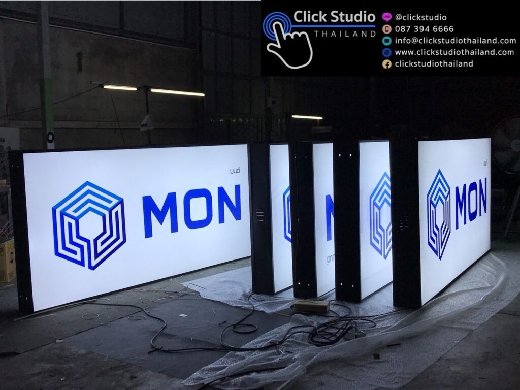 ป้ายที่ใช้โฆษณา มีแบบวงกลม สี่เหลี่ยม และกล่องไฟไดคัท ไฟออก 1 ด้าน ไฟออก 2 ด้าน เป็นโครงเหล็กพร้อมฝาครอบซิงค์ทำสี / สแตนเลสเงิน / สแตนเลสทอง และมีกล่องไฟล้อเลื่อน